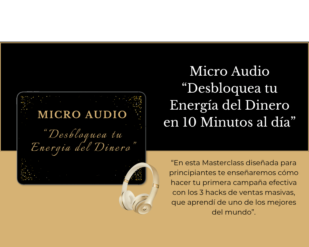 Activa tu poder interno de manifestación en menos de una semana para atraer dinero en tu vida, reprogramando tu subconsciente y transformando la frecuencia de tu campo energético con un micro audio que solo te tomara 10 minutos al día, sin necesidad de tener experiencia previa, ni meditar durante horas y aunque hayas intentado manifestar antes “.
